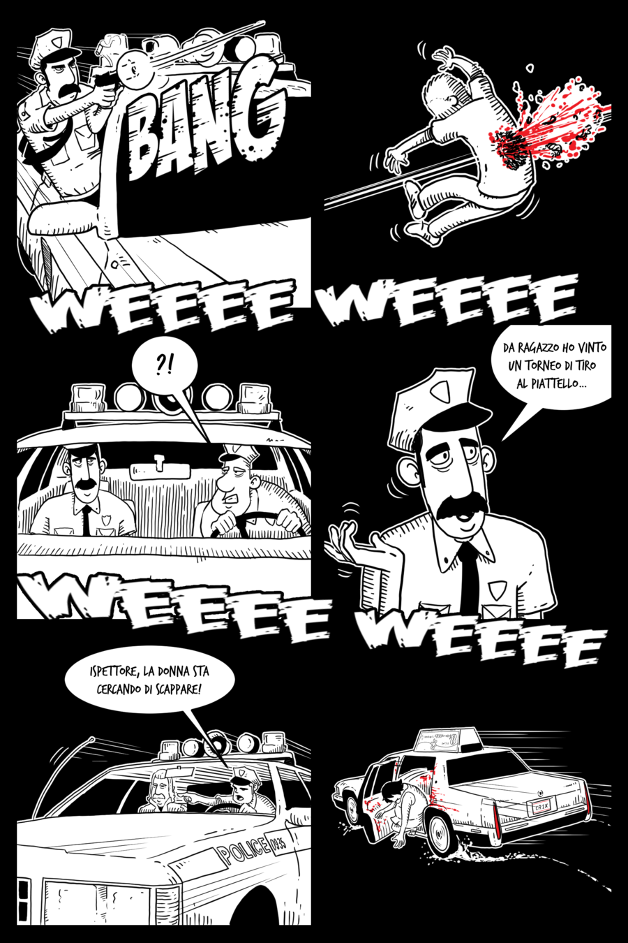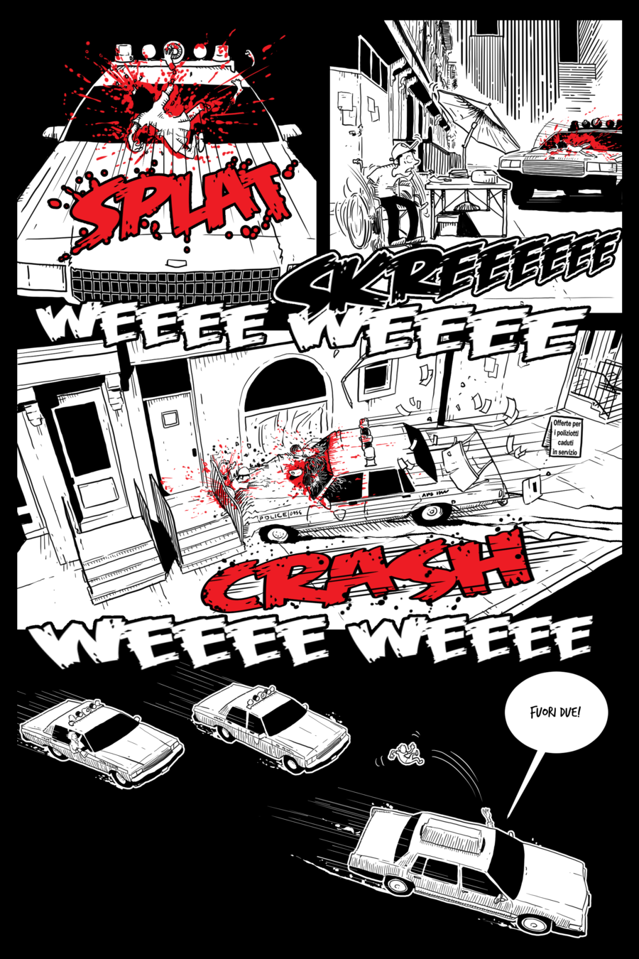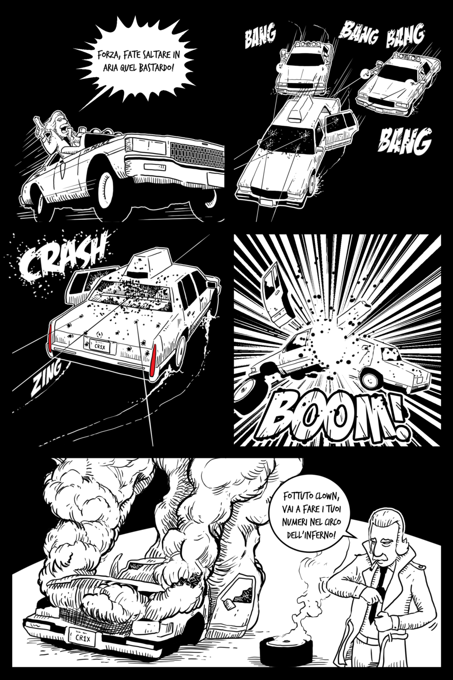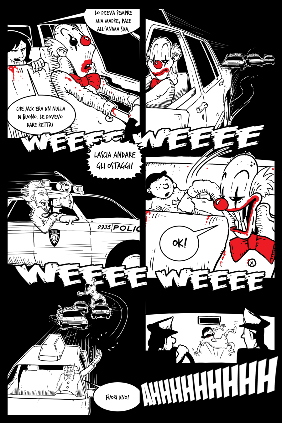 Breve fumetto, edito da Periscopio Edizioni, contenuto in una raccolta di storie da brividi, disponibile in fumetteria, libreria e online sul sito dell’editore e pure su Amazon. La pubblicazione raccoglie 6 storie splatter/horror, interpretate da diversi fumettisti, tra cui il sottoscritto, attorno alla figura del “Clown Eddie“. L’episodio che ho disegnato è stato scritto e sceneggiato da Fabrizio Fassio (tra l’altro l’editore), e consta di 10 tavole in bianco e nero (e rosso sangue!).