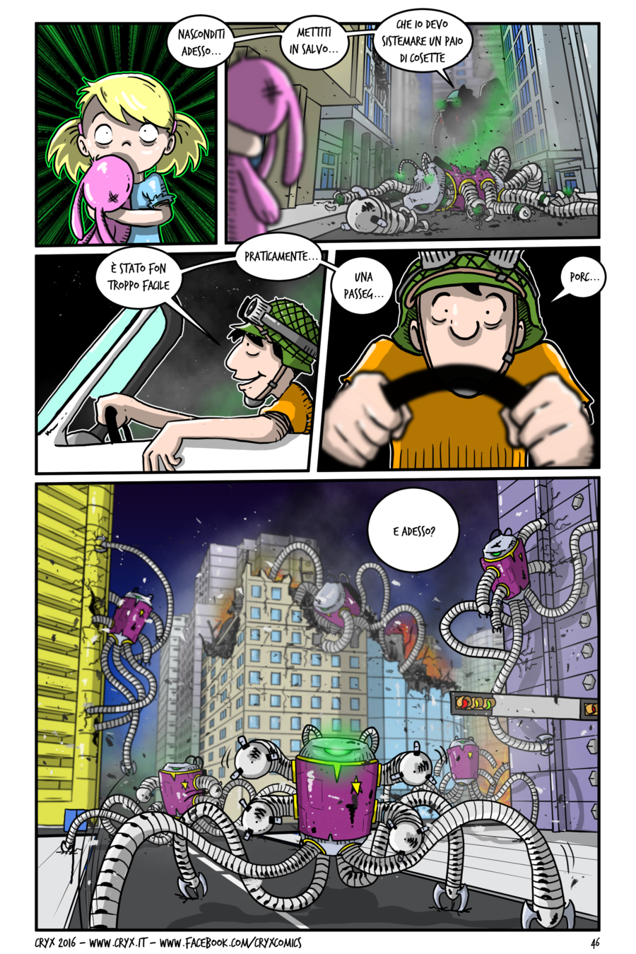 E’ il caso di questo ultimo fumetto, nel quale ho impiegato un sacco di energie e di cui sono molto soddisfatto sia per l’intreccio narrativo che ho imbastito, sia per gli stratagemmi grafici che ho usato e che non avevo mai tentato (nelle prossime tavole vedrete). Eppure non decolla. Sono convinto che dovrebbe risultare appetibile per un pubblico interessato normalmente al mondo nerd, con citazioni varie sparse dappertutto. Le reazioni (che misuro come interazioni e commenti, sul sito di Tom’s Hardware e sulle pagine Facebook) sono però mosce e quasi assenti. E le poche interazioni non sono positive, purtroppo. E proprio nel momento clou, in cui le visite, le condivisioni e le reazioni avrebbero dovuto crescere, sono crollate. Sono convinto che questo fumetto mal si adatta al meccanismo del web-comic, ovvero lo spezzettamento in uscite cadenzate di poche tavole. Seppure abbia fatto uno sforzo per cercare di mettere qualcosa di interessante ogni puntata, riconosco che la narrazione appare faticosa e, quindi, il fumetto meno godibile. Però, evidentemente, c’è dell’altro e devo capire.