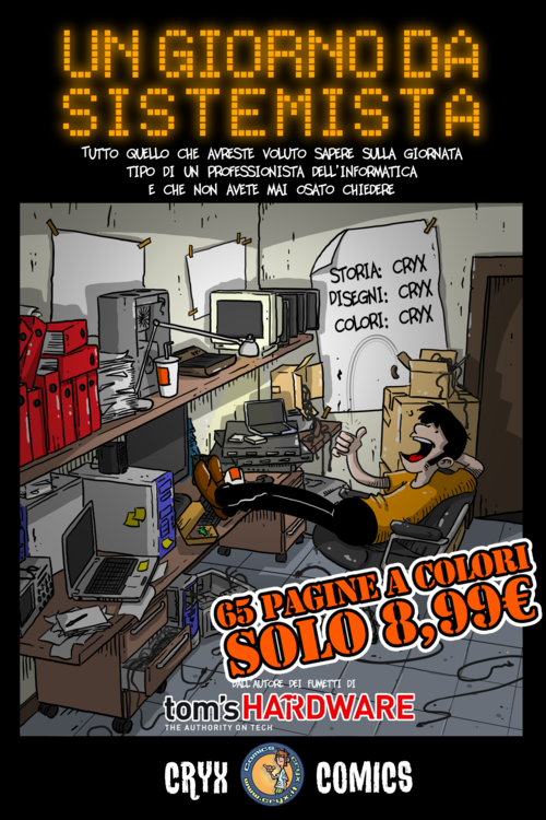 L’amico che ne sa di informatica, quello che lo fa di mestiere, il sistemista. Ce l’abbiamo tutti, magari è persino un parente. Ma chi e’ davvero? Com’è diventato quello che è? Ha sempre sognato di fare quello che fa o gli è capitato? Il nuovo fumetto di Cryx risponde a queste domande facendo l’occhiolino a Fantozzi, con un’ingenua freschezza curiosamente mixata al sarcasmo pungente e disilluso. Un libro che si divora di corsa e che si ricorderà a lungo.