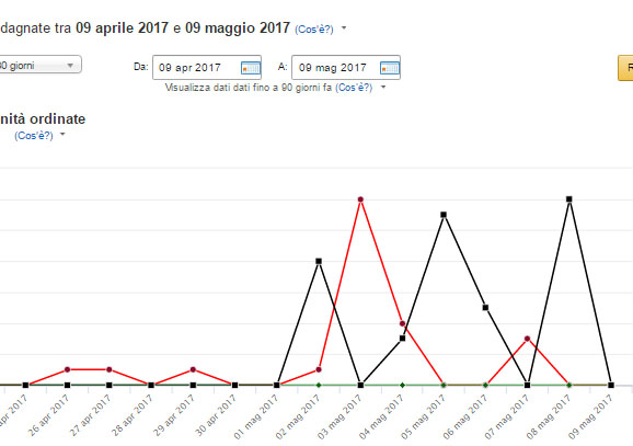 con report in tempo reale delle vendite che ti consente anche di controllare l’andamento delle “promozioni”. Nel grafico dei primi giorni si vede un picco corrispondente all’uscita dell’articolo su Tom’s Hardware (rosso = ver. kindle, nero = cartaceo) considerando che il cartaceo è sfasato di 1/2 gg dovuti ai tempi di stampa (Amazon ti indica solo le copie pagate e spedite).